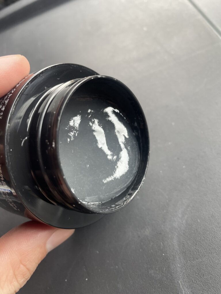 フタを開けると、黒い容器のせいで黒く見えますが、中身は**「乳白色」のジェル**です。